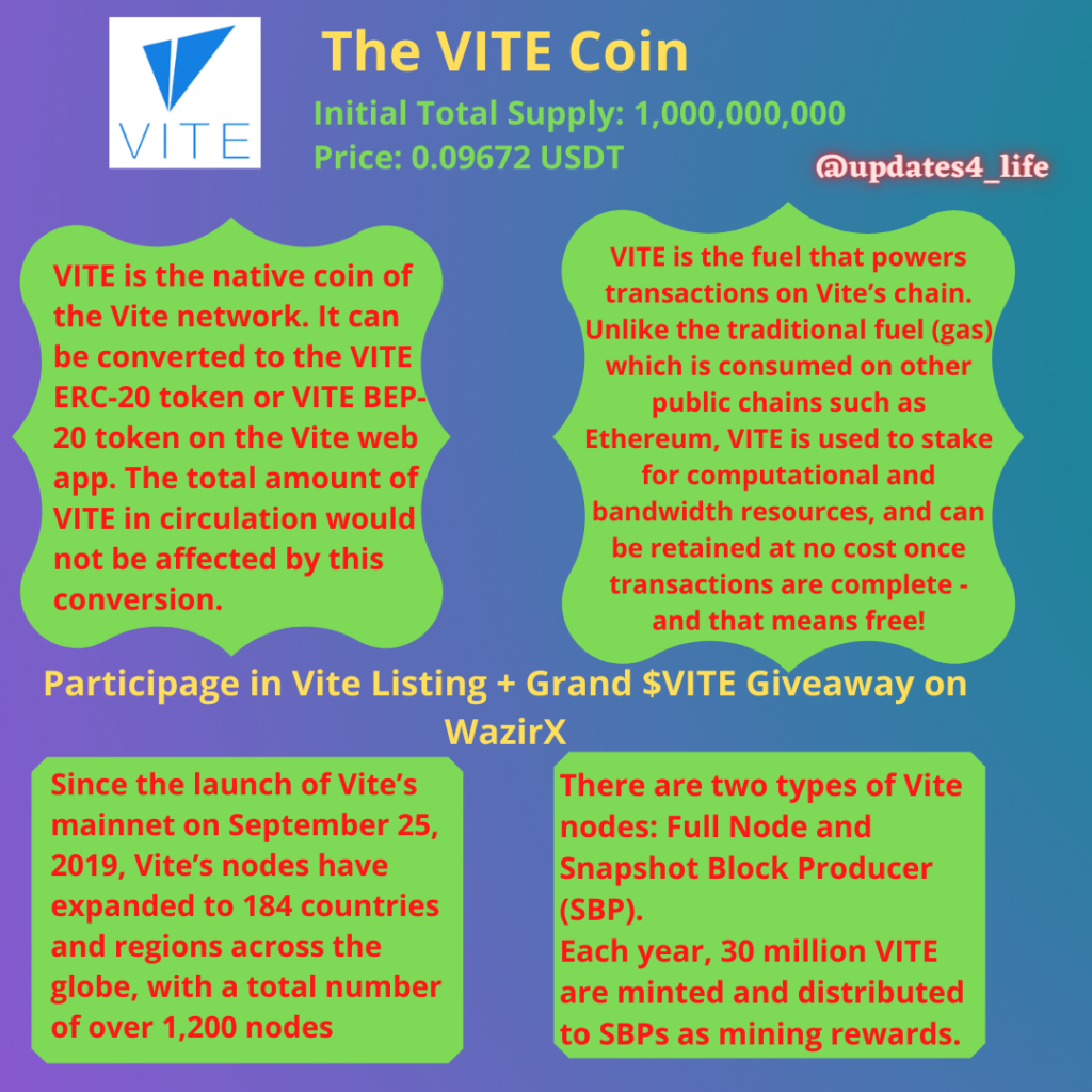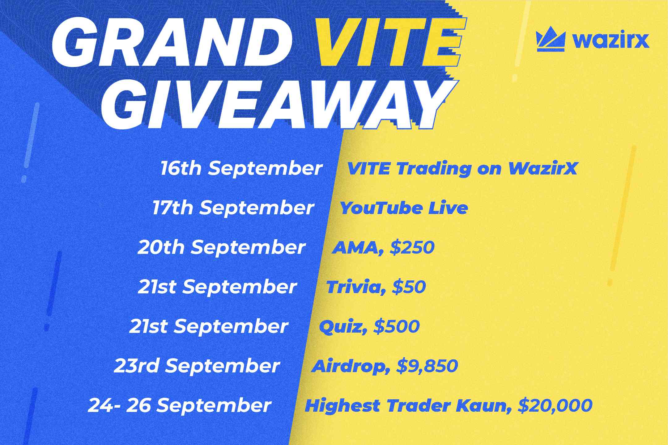 VITE is already listed on WazirX on Wednesday, 16th September and you will be able to buy, sell, trade VITE in INR and USDT market. WazirX is also running a giveaway for you via a host of activities.